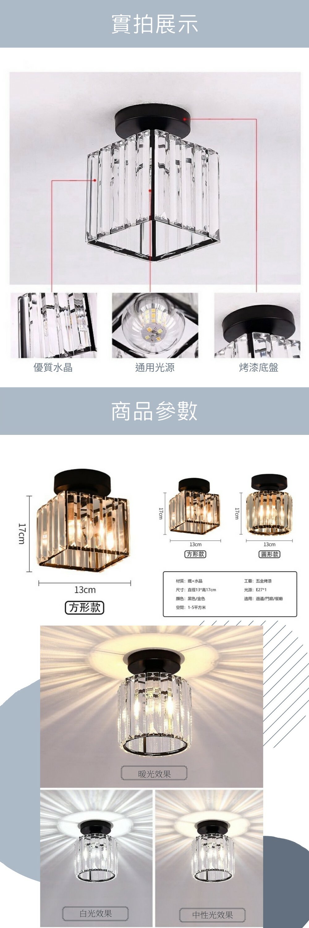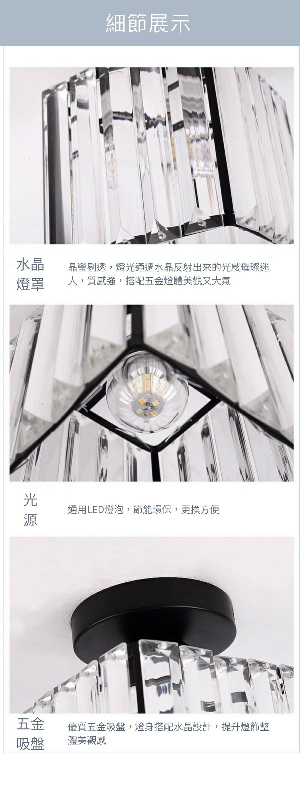 光源: E27通用燈頭,適用LED燈泡(需另行選購),瓦數依照實際坪數大小選用(10W、13W、15W)
